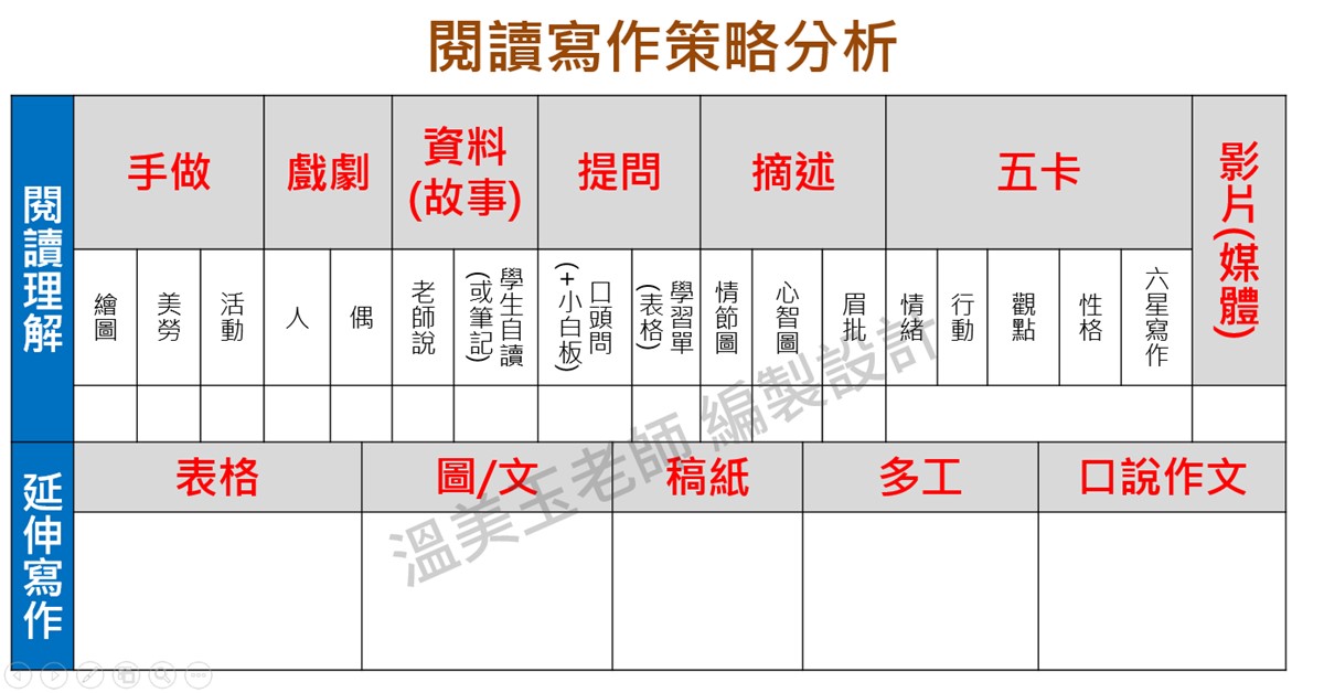 在這一場研習裡,溫美玉老師從《閱讀理解到延伸寫作》製作成一張上位概念表。從表格當中,我們發現原來進入「閱讀理解」的方法可以這麼趣味、多元。即使是新手教師,面對不熟悉的課程,一樣可以運用策略幫助學生學習。